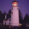 | This picture of the Umpqua River Light, Winchester Bay, Oregon was taken long after the sun had set. The darkening shades of twilight turned the sky as well as the lighthouse a rich violet hue. This is one of the few lighthouses along the oregon coast that you can see up close because it is located in a State Park. | |